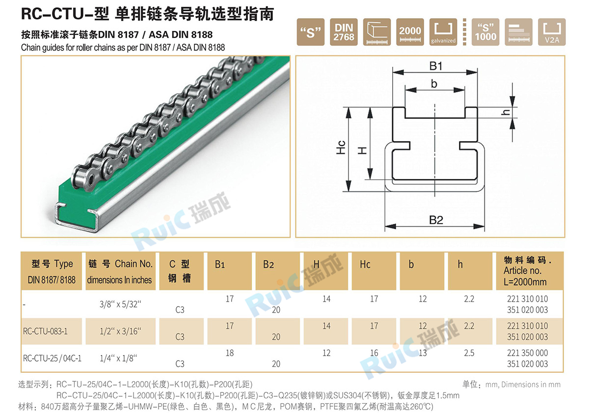 鏈條導軌-鏈條導向件,是一種靜壓導軌,用于支撐和導向鏈條,減少鏈條磨擦,降低噪音,增強鏈條使用壽命。采用840萬超高分子量聚乙烯(UHMW-PE)生產,鏈條導軌具有高耐磨耐溫,抗腐蝕,穩固,降噪音等高精度的支撐與導向。