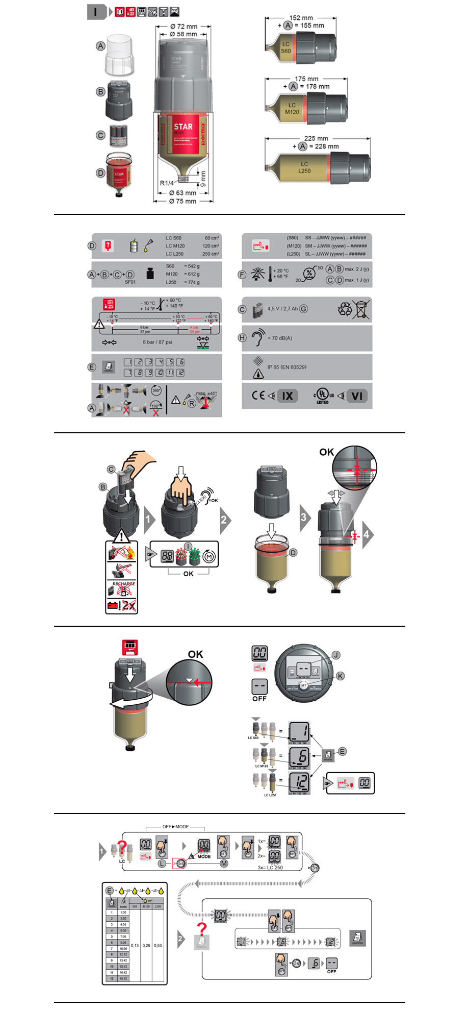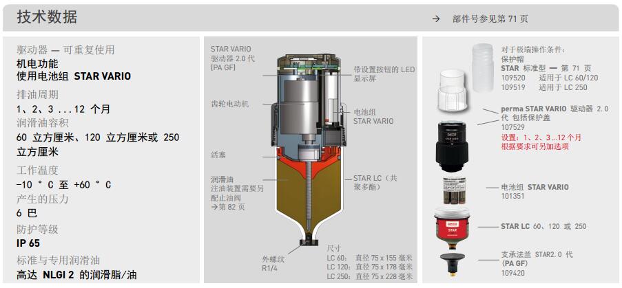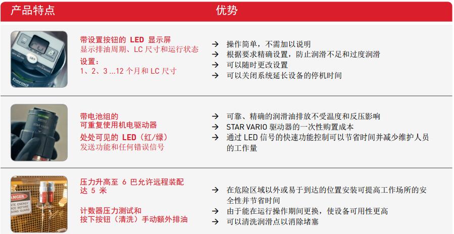 perma STAR VARIO 全自動操作,不受溫度和壓力的影響而且排油非常精確。該系統(tǒng)包括機電驅(qū)動器、裝 60、120 或 250 立方厘米潤滑油的 LC 和電池組。方便使用設(shè)置按鈕選擇所需的排油周期和 LC 尺寸并立即顯示在顯示屏上。在顯示屏上以及通過處處可見的 LED 信號燈(紅/綠)顯示當(dāng)前的運行狀態(tài)。LED 信號也可以遠程識別。